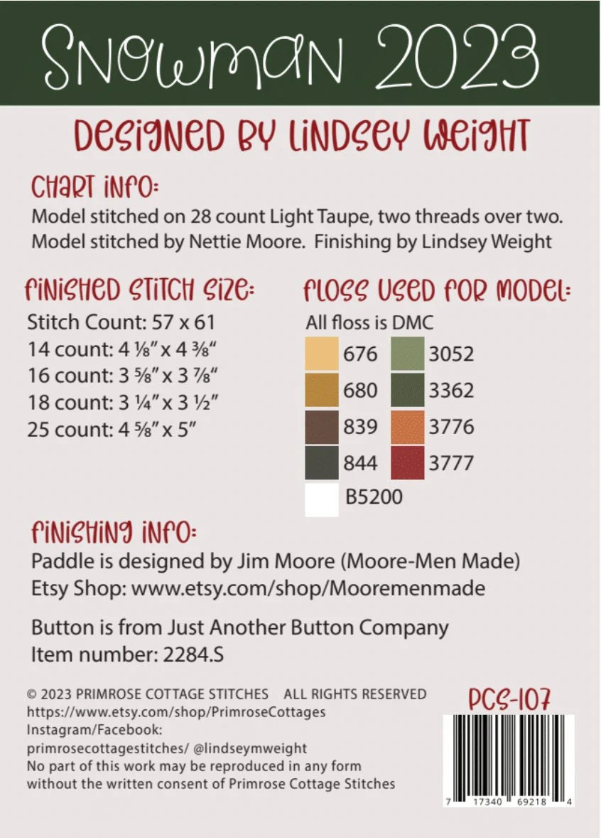 Primrose Cottage Stitches - Snowman 2023, PCS-107 Lindsey Weight